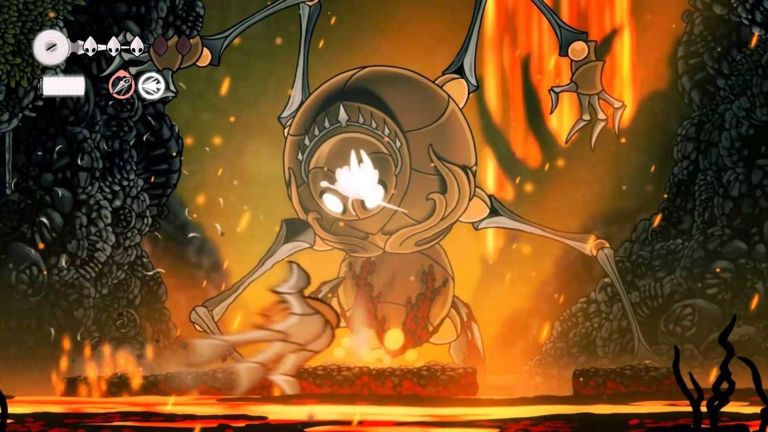 - Phase 2: Falling Rocks and Platform ChangesAfter you have stunned the boss once, it will begin to add a new attack to its repertoire: raining down flaming rocks from the ceiling. You will need to continue avoiding the hand swipes and slams while also keeping an eye on the falling rocks. Stay mobile and use your Drifter’s Cloak to position yourself between the falling debris. The platforms will also crumble more often in this phase, so you will need to rely on your gliding and air dashes to stay off the lava.